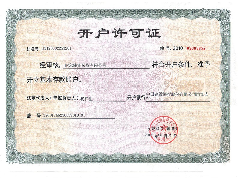 耐爾能源裝備有限公司開戶許可證
